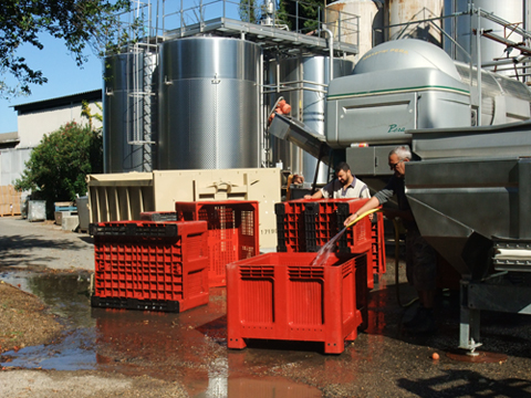 Una volta passata alla diraspatrice, l’uva viene convogliata velocemente in pressa.