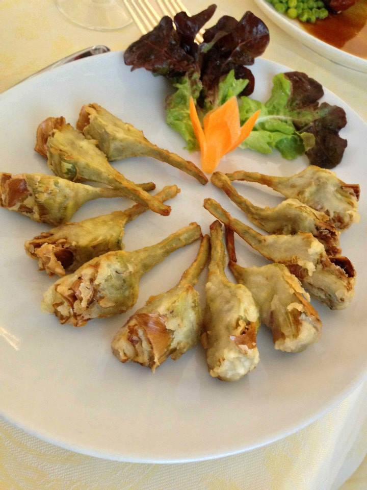 Su tutto il resto. Anche in questo caso un menu tipicamente italiano prima ancora che romanesco. Anche se alla cucina tradizionale capitolina è dedicato un intero paragrafo. Si va anche dal pesto alla genovese alla salsa alla Bolognese, fegato alla veneziana e via andando. Poi ci sono i piatti speciali, suggeriti addirittura in rosso. Non abbiamo resistito, tra questi, al fascino della “valigetta diplomatica”: un involtino di tacchino ripieno di prosciutto e formaggio, con contorno di piselli al burro. Un piatto anni Settanta di grande successo, ahimè completamente rovinato da un eccesso di sapidità e una salsa alcolica evidentemente mal sfumata. Decisamente meglio i carciofini fritti serviti come contorno.