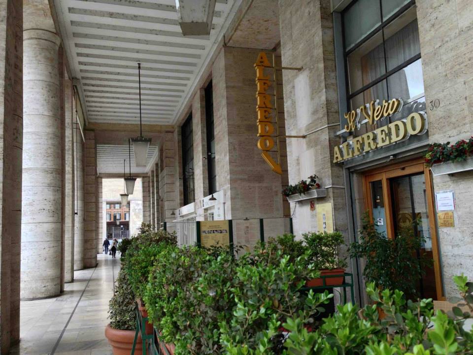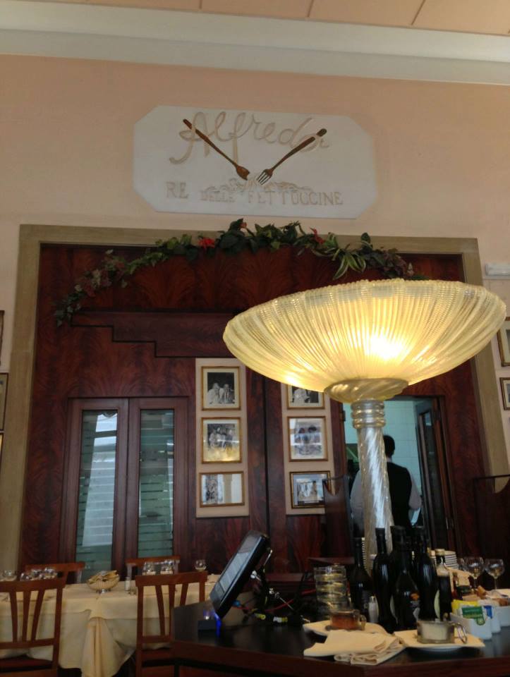 Ore 14.00: prenotazione dal Vero Alfredo, in piazza Augusto Imperatore. Anche in questo caso si ha subito l’impressione di entrare in un classico ristorante dall’atmosfera d’antan, qui suggerita dai tanti elementi d’arredo in art decò. Spazi ampi, tavoli grandi e ben distanziati, tanti camerieri vecchio stile, con un direttore di sala a coordinare un servizio presente ed efficace. Qui però si registra un tocco decisamente più turistico, con un’iconografia classica adattata in maniera folcloristica al mito delle fettuccine.