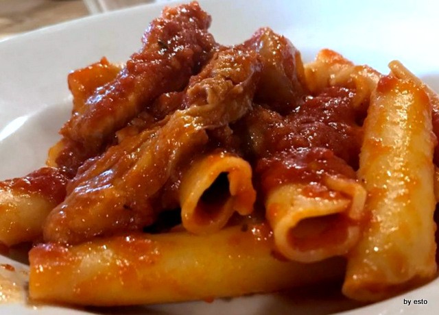 Maccarune c’o rraù ‘e tracchie e braciola ‘e cotena. Candele spezzate a mano con ragù di costine e cotica