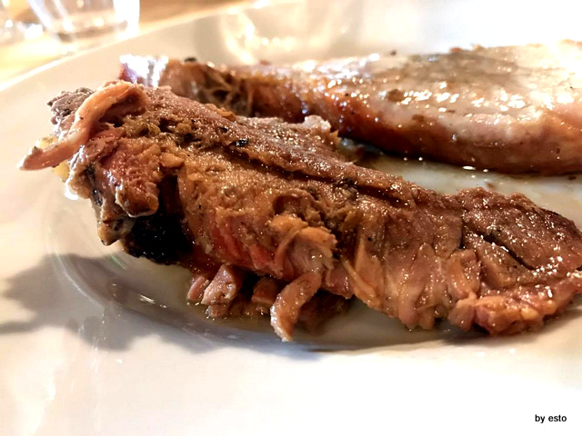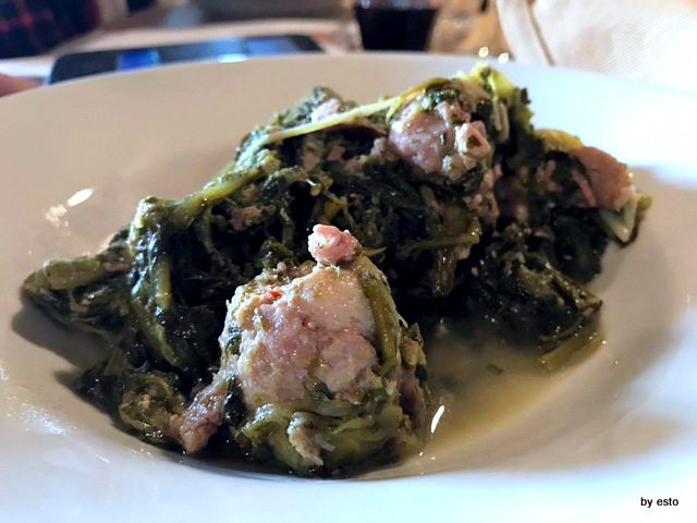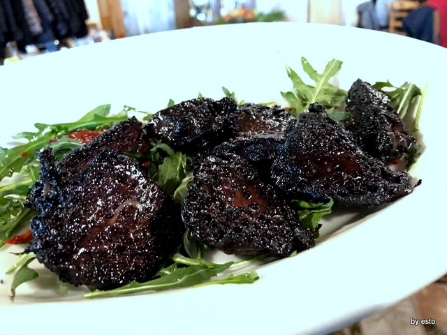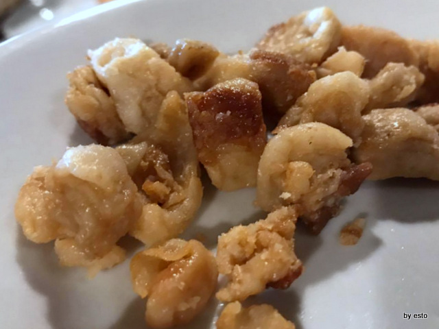 Sanghe ‘e puorco, Sangue di maiale, sì sangue vero, bollito e poi fritto con spatella e lauro.