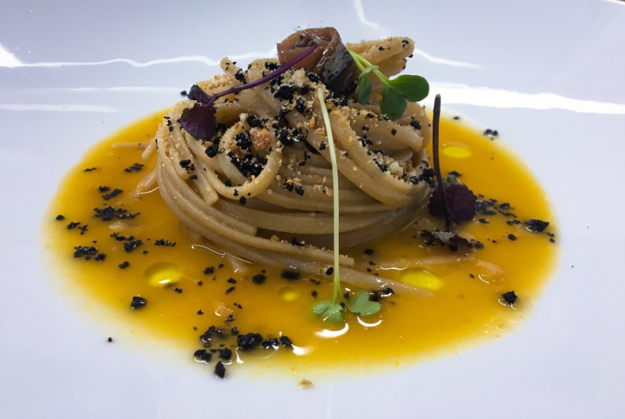 Stroncatura secca calabrese con pomodorino giallo, crumble di pane e terra di olive nere. La stroncatura un piatto povero e umile che racchiude tutta la cultura del cibo del Sud, secondo la quale ogni alimento è sacro e non va mai sprecato. Ecco come un piatto della tradizione calabrese con un po’ di innovazione diviene gourmet.