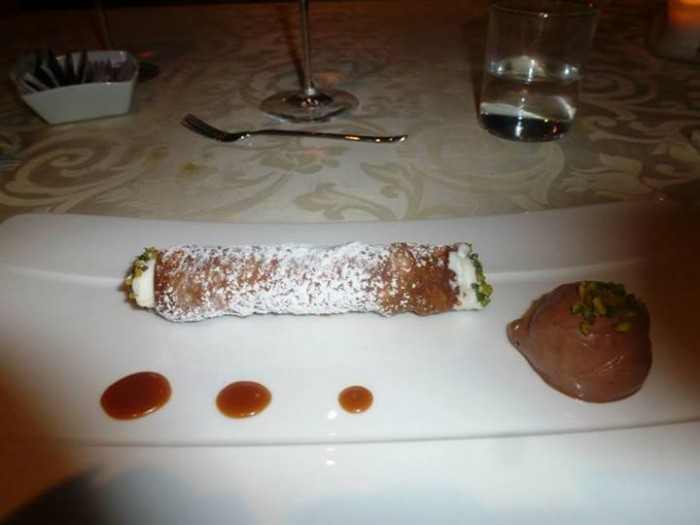 La pasticceria segue l’impostazione della cucina: cannolo di ricotta al limone con caramello salato e mousse al cioccolato Guanaya; Zabaione ghiacciato con salsa al miele di corbezzolo e sorbetto di ananas.
