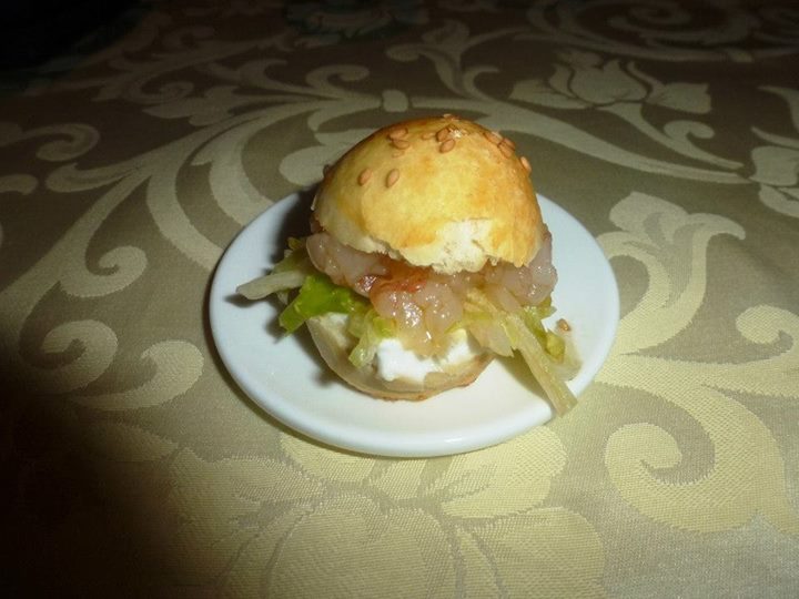mini hamburger farcito di tartare di limone, olio e sale, gamberi crudi