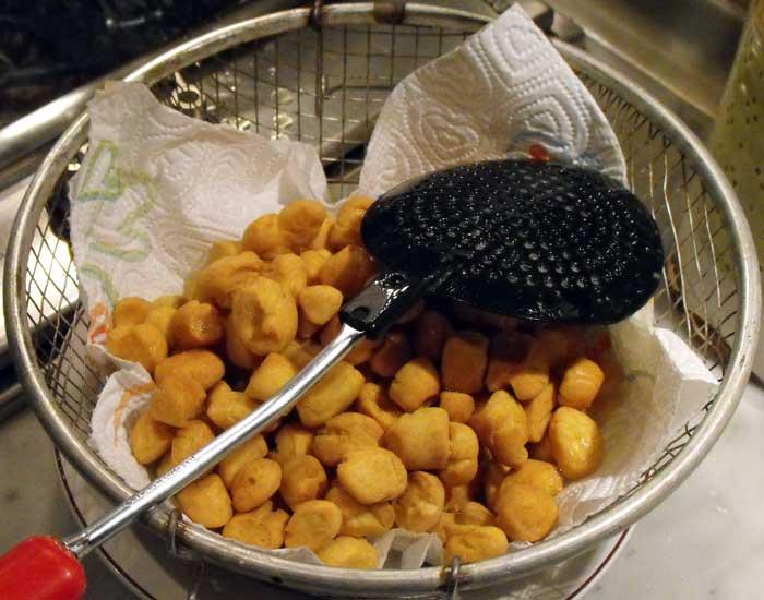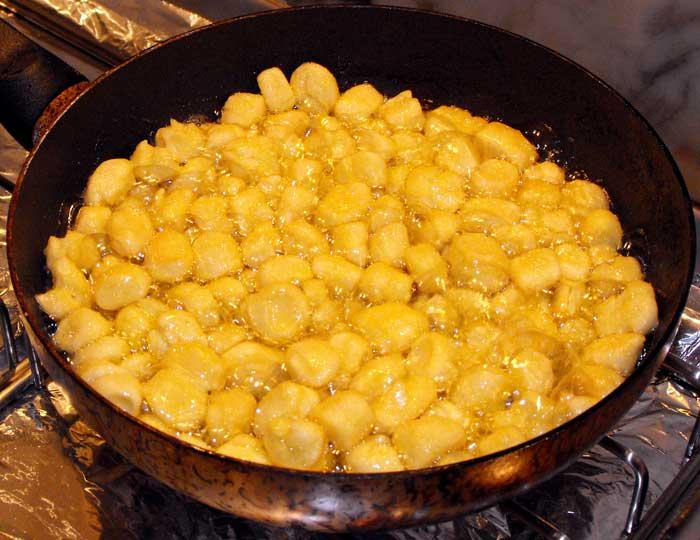 Facendo attenzione a non farli “incollare” l’uno con l’altro, friggere gli struffoli, pochi per volta, in una buona dose di olio extra vergine di oliva ben caldo finché non diventeranno dorati.