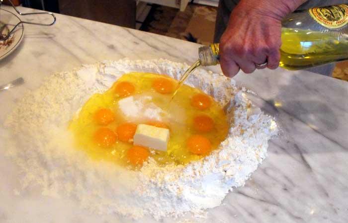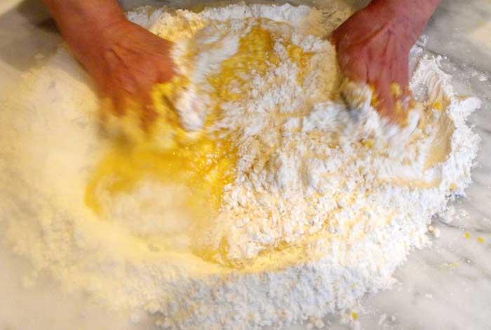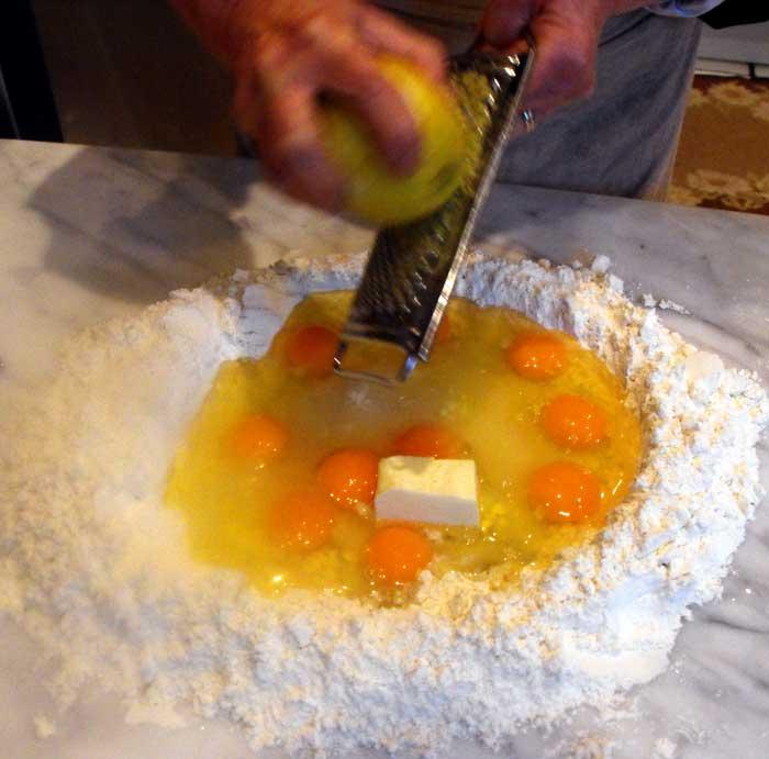 Impastare sul tavolo di lavoro scelto la farina disposta a fontana (a forma di “cratere”) con gli altri ingredienti previsti, aggiungere i “liquori” (un blend di Strega e Grappa) e grattugiare la buccia degli agrumi (limone ed arancia).
