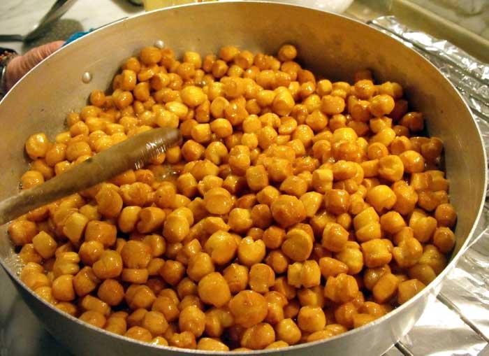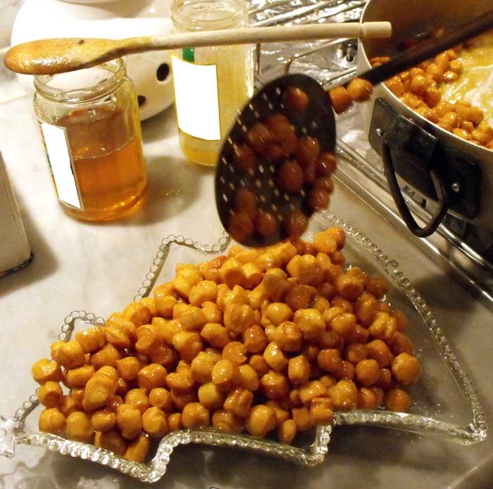 Quando scompare la leggera schiuma che si è formata a causa della caramellizzazione, versare gli struffoli nel liquido dolce caldo e mescolare delicatamente in modo che le “dorate sferette fritte” si rivestano uniformemente di miele e lo assorbano completamente.
