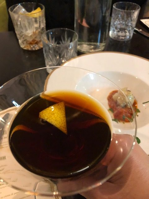 Pollo con i peperoni sono un classico della cucina romana, rivisitati qui al Suburra in bocconcini morbidissimi su una crema di peperoni rossi abbinati allo Strega (Liquore Strega Alberti, Vermuth Rosso Carpano, Angostura bitter) dolce e aromatico il cocktail trova un vero connubio goloso con il piatto. Per concludere biscotti secchi, tozzetti e ciambelle al vino con Dolce Rione (Amaretto di Saronno, Succo di limone, Sciroppo di Cannella, Albume e twist di limone).