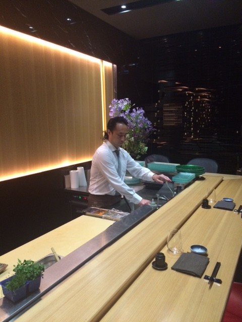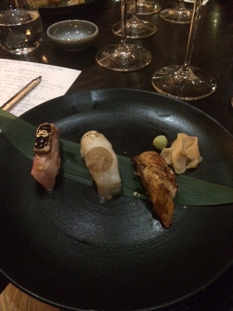 I Nighiri di Anguilla, Toro e fois Gras, Scampo con olio tartufato sono essenziali bocconi aromatici e grassi che appaiono perfetti con il Cloudy Bay Pinot Noir 2014 vino equilibrato senza particolare impressione.