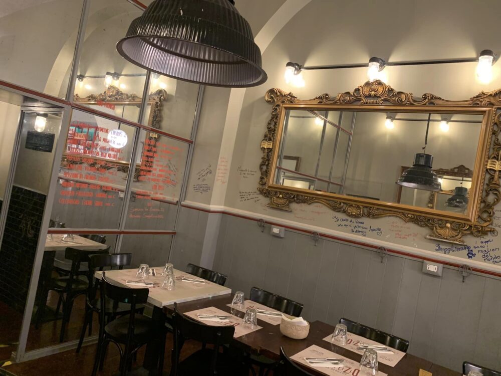 Con un bel bancone all’ingresso, pochi coperti su tavolacci in legno dalla mise en place minimale; arredo con più di qualche richiamo d’antan e le immancabili automobiline da collezione, proprio come negli altri locali di Dandini, l’ambiente suggerisce l’idea di pieno relax e, soprattutto, di tema a … traccia libera. Molto più vicina al ‘vini e cucina’ di una volta che all’osteria contemporanea.