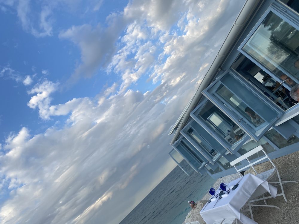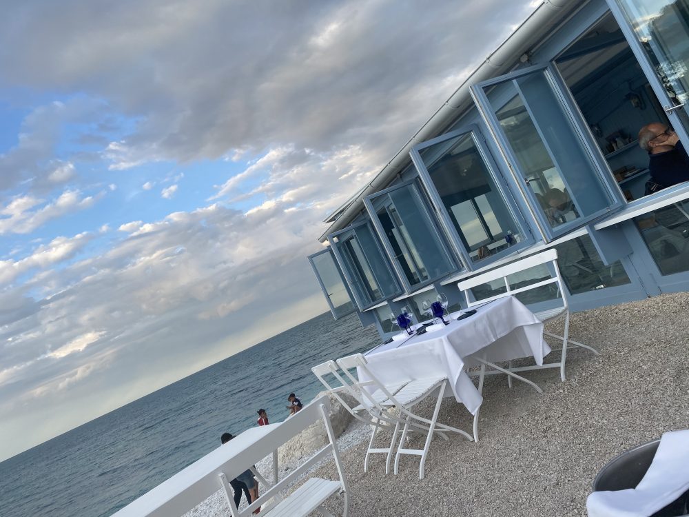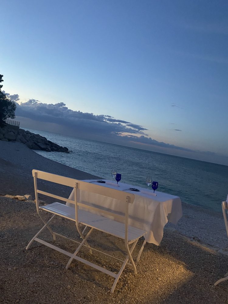 Al Clandestino si dovrebbe andare per festeggiare un amore o a rinvigorirne uno appassito, chè basta essere lì per innamorarsi di nuovo, come fosse il primo giorno. Al Clandestino si va d’estate, tra un bagno e l’altro nell’Adriatico ai piedi del Monte Conero, si va a pranzo per un paio di street-food o a cena per il gran menu a tema, si va per un gin tonic e due noccioline, si va con il caldo, ma anche quando soffia il vento, si sta all’aperto con una copertina sulle ginocchia osservando il mare che si increspa, che sbatte sullo scoglio, da questa palafitta rettangolare che sembra quasi un tank con le finestre, dipinto di bianco e di azzurro con le lampade di Groppi, le tovaglie candide e le posate lunghe e affusolate.