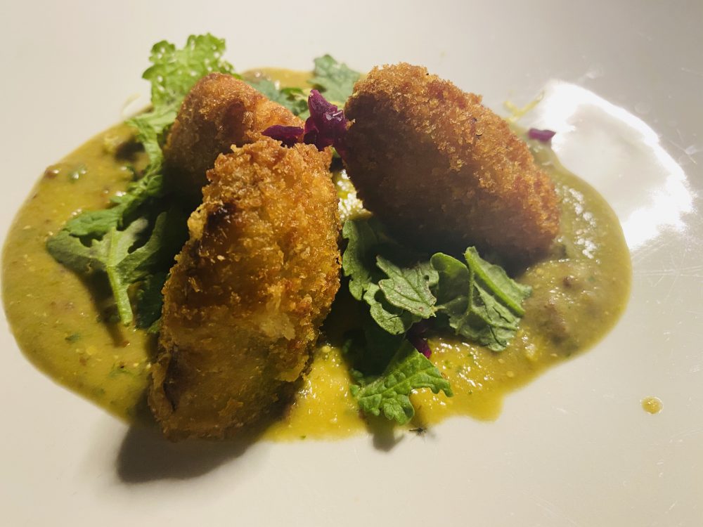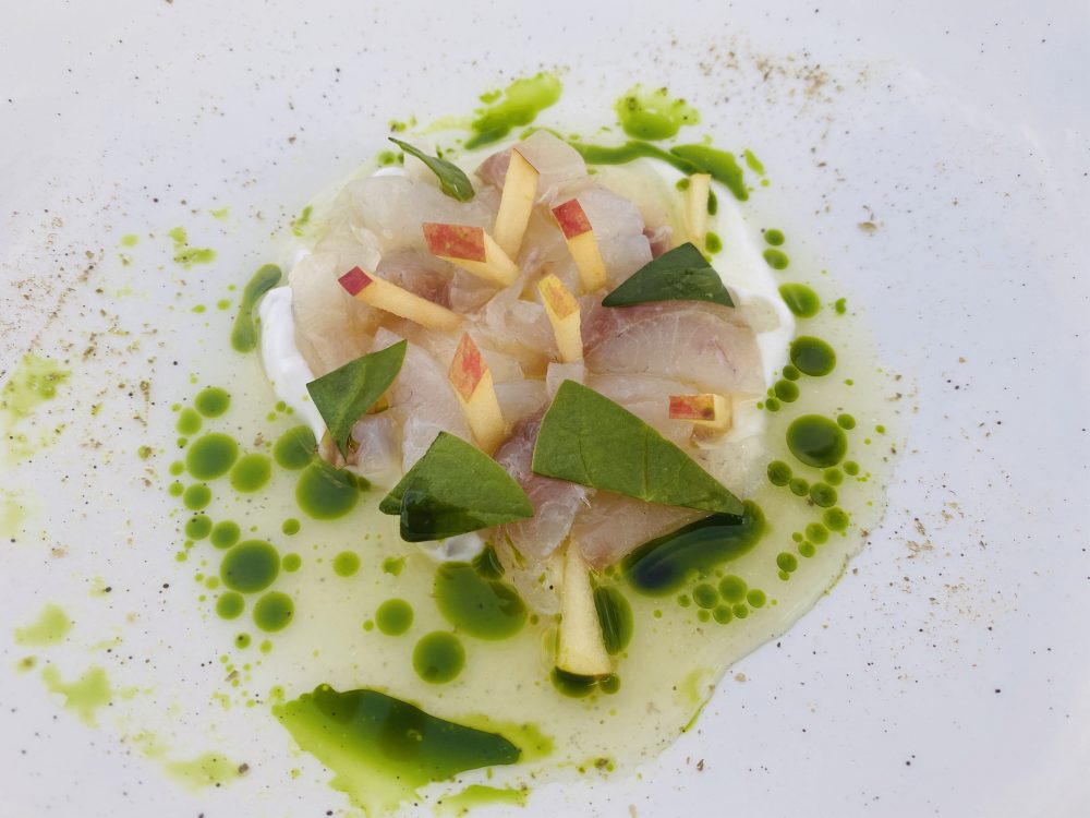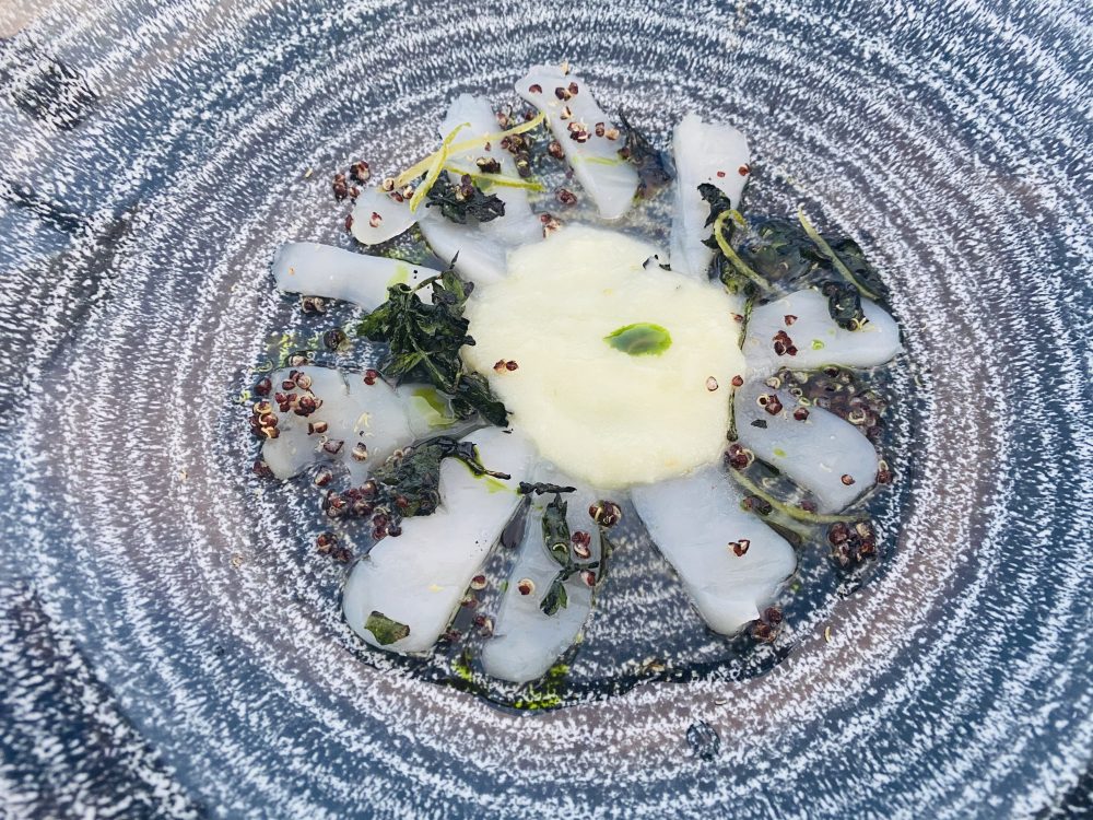 Al Clandestino, Moreno propone sempre il connubio tra pesce crudo o poco cotto, leggere fermentazioni, estrazioni e note dolci di frutta o di salse esotiche, preferibilmente orientali. La capasanta non poteva che essere dedicata ad Afrodite (i riferimenti all’abusata Venere di Botticelli si sprecano), che secondo Omero nacque da una conchiglia sospinta dal mare, qui impreziosita di pure al sambuco, quinoa, prezzemolo bruciato.