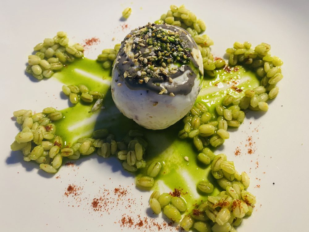 A Demetra, dea della prosperità, è intitolato il piatto forse meno riuscito del lotto: polpo, orzo perlato e uovo in camicia, in cui i tre ingredienti restano ognuno un po’ per conto proprio.