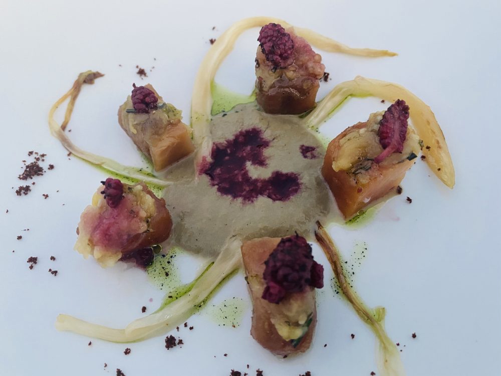 Omaggio agli dei della mitologia greca, signori, torniamo per una sera traduttor dei traduttor di Omero! Si inizia con Dioniso e il suo coro di baccanti, con il consueto ghiacciolo, quest’anno di idromele, mirto, mastica, vermut e chinotto, lievemente alcolico in forte odore di macchia mediterranea. Molto cedroniano in versione “light” Poseidone, orata con tzatziki, acqua di cetriolo fermentato, mela e olio al basilico.