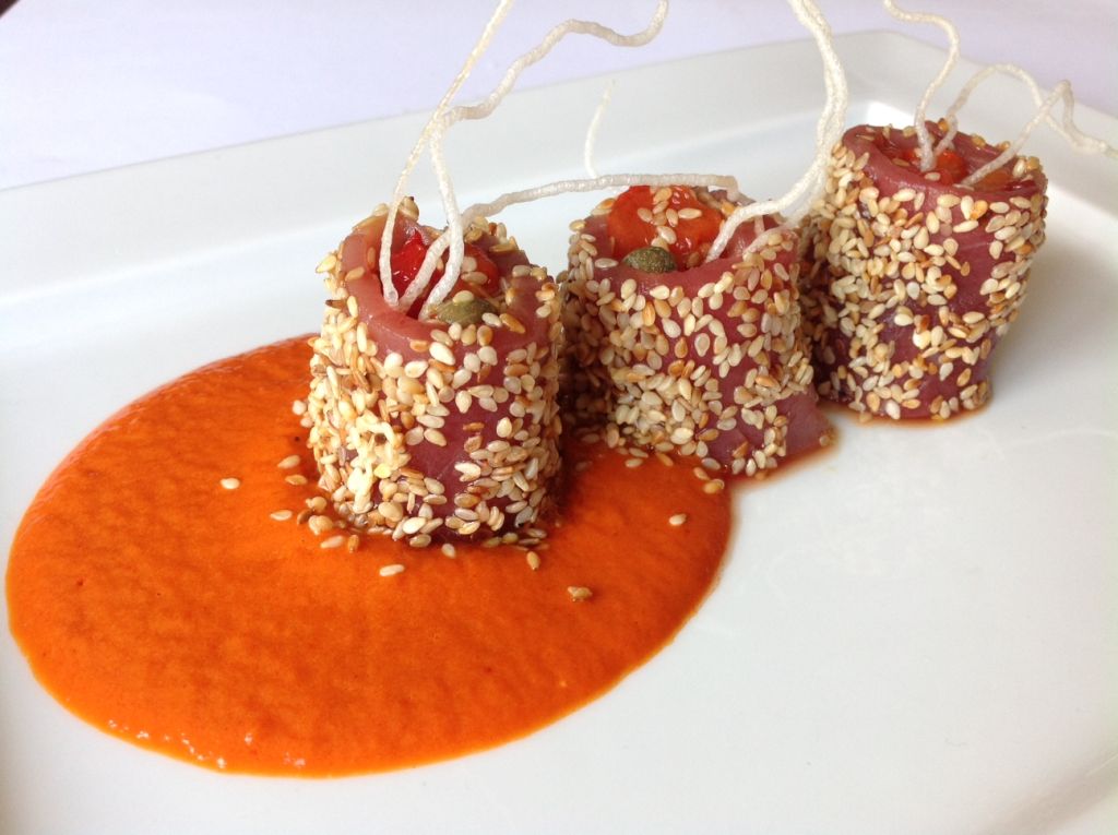 6) Comporre il piatto versando la crema di peperone a specchio, adagiare gli involtini di tonno in piedi e finire con i vermicelli di riso, da aggiungere a piacimento.