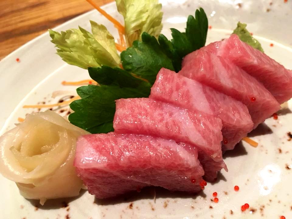 Si prosegue con lo sfilettato. Il Sashimi & Il Carpaccio di Ventresca. Il primo adeguatamente bilanciato secondo la tradizione di Jorudan Sushi, Ponzu, Togarashi e una miscela di componenti segrete. Finissimo. Ben equilibrato. Il sashimi è porzionato secondo la tradizione nipponica della sezione quasi cubica. Generalmente i pesci più pregiati nei mercati vengono serviti proprio cosi, in pezzettoni più spessi e ridotti nella sezione in lunghezza. Una vera e propria concentrazione di salinità e burrosità. In abbinamento, Domaine Ott Bandol Rosè 2013.
