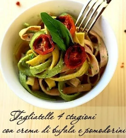 Tagliatelle 4 stagioni con crema di bufala e pomodorini 28/3/2013 Torna a: Tagliatelle 4 stagioni con crema di bufala e pomodorini | Contest Le Strade della Mozzarella Tagliatelle 4 stagioni con crema di bufala e pomodorini