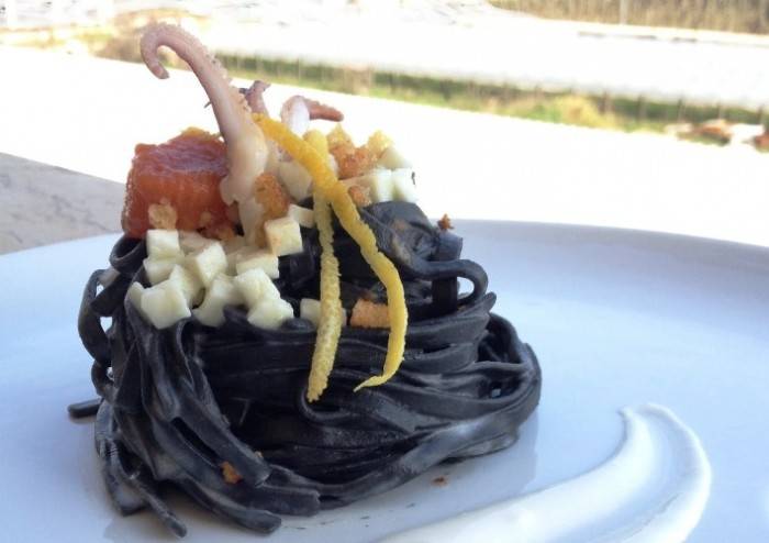 Tagliatelle mare e mozza: tagliatelle nere con calamaro, cubetti di mozzarella e pane croccante, mantecate alla salsa di mozzarella | Contest Le Strade della Mozzarella