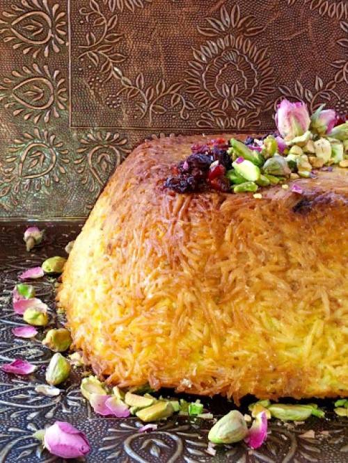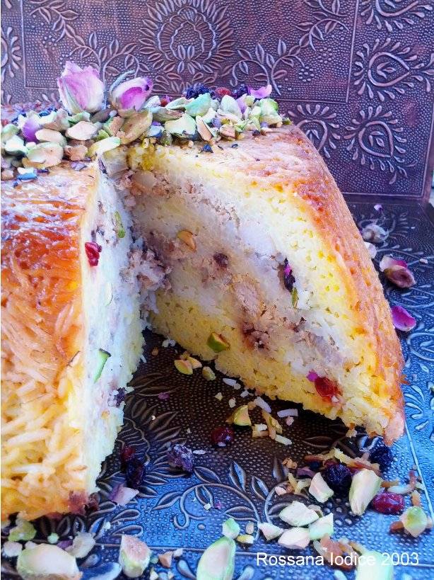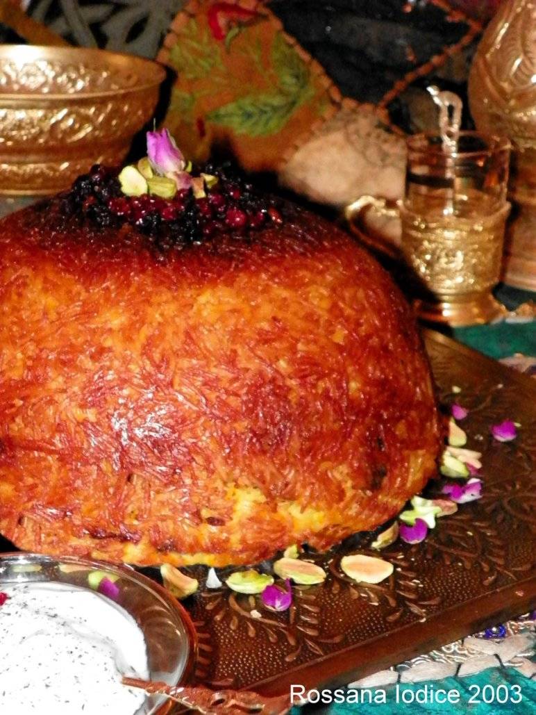 Dopo la magnifica panoramica sui timballi italiani presentata dalle mie abili Compagne di Blogger, vorrei proporvi un timballo che viene dalla lontana Persia, quale testimone di una cucina tanto ricca e raffinata, quanto ancora poco conosciuta ed una tradizione culinaria che ha le sue radici nell’antichita’ . Una cucina influenzata profondamente dal concetto del dualismo di Zarathustra: il contrasto tra caldo e freddo, aspro e dolce, morbido e croccante e persino tra colori scuri e chiari e’ sempre presente. E questo timballo, che racchiude in se, in un armonico insieme, i sapori, i colori ed i profumi dell’Oriente, ne e’ un esempio perfetto.