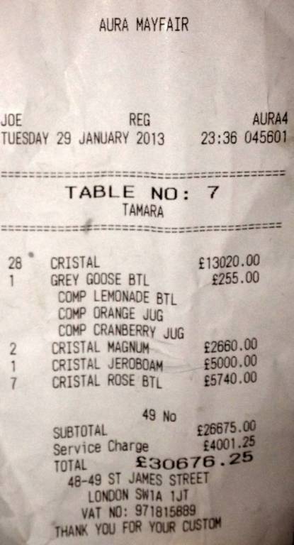 Vista la faccia da sogliola lessa del suo accompagnatore, l’esuberante Tamara Ecclestone si è data allo Champagne e ha fatto bene. Ne ha consumato oltre trentamila sterline in una sola serata suscitando lo sdegno di tutti i tabloid del Regno Unito che hanno fatto la corsa a pubblicare conto e foto.