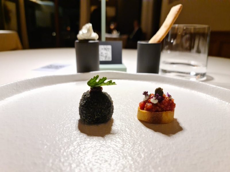 Ancora un altro piatto spiazzante, il favo di mele, acciughe al sale e insalata piccante di rucola selvatica e limone nero. Il favo di miele media appena appena le note sapide e amare degli altri ingredienti, il tourbillon è continuo, tanto difficile da diventare goloso. Il piatto del viaggio, senza dubbio. Sapidità e note balsamiche per il mare alla brace. Il risotto in bianco al rafano, mirtillo di bosco acetificato, pippali ed abrotano è un piccolo capolavoro. Lo yogurt di ceci, pasta di lievito madre, pomodori essiccati sulla brace e levistico, ricrea il gusto e la sensazione della pasta, senza avere la pasta.