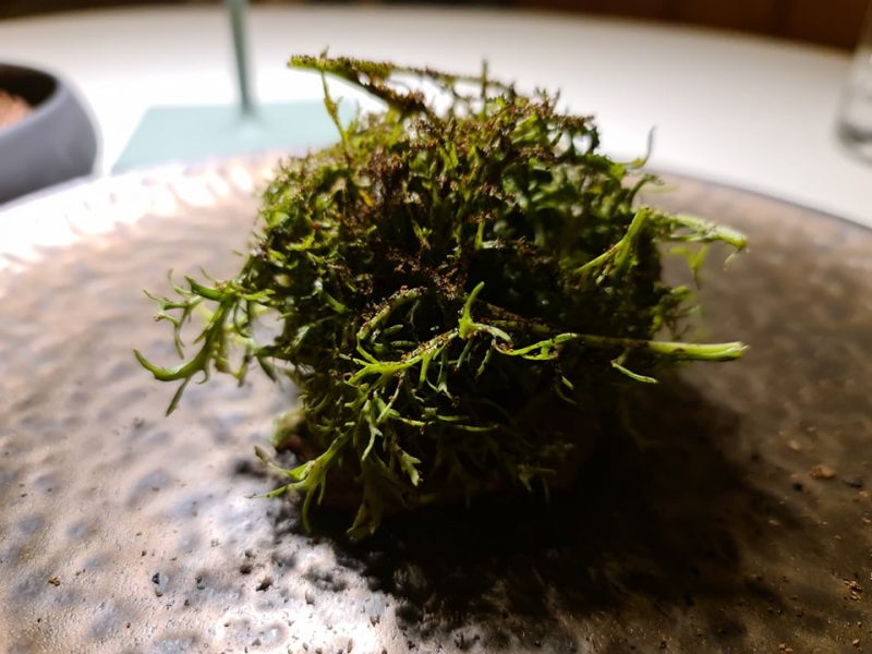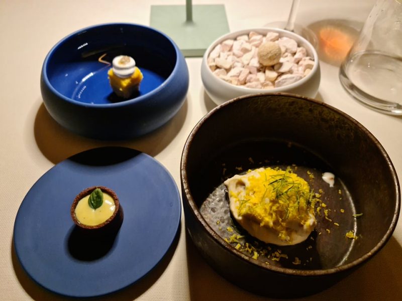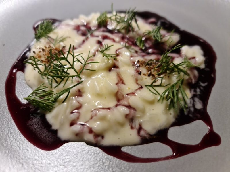 Ancora un altro piatto spiazzante, il favo di mele, acciughe al sale e insalata piccante di rucola selvatica e limone nero. Il favo di miele media appena appena le note sapide e amare degli altri ingredienti, il tourbillon è continuo, tanto difficile da diventare goloso. Il piatto del viaggio, senza dubbio. Sapidità e note balsamiche per il mare alla brace. Il risotto in bianco al rafano, mirtillo di bosco acetificato, pippali ed abrotano è un piccolo capolavoro. Lo yogurt di ceci, pasta di lievito madre, pomodori essiccati sulla brace e levistico, ricrea il gusto e la sensazione della pasta, senza avere la pasta.
