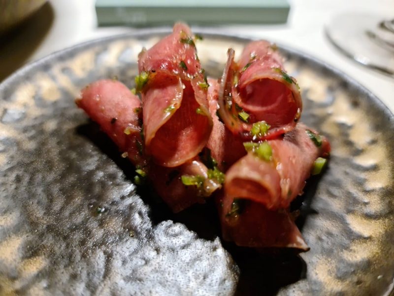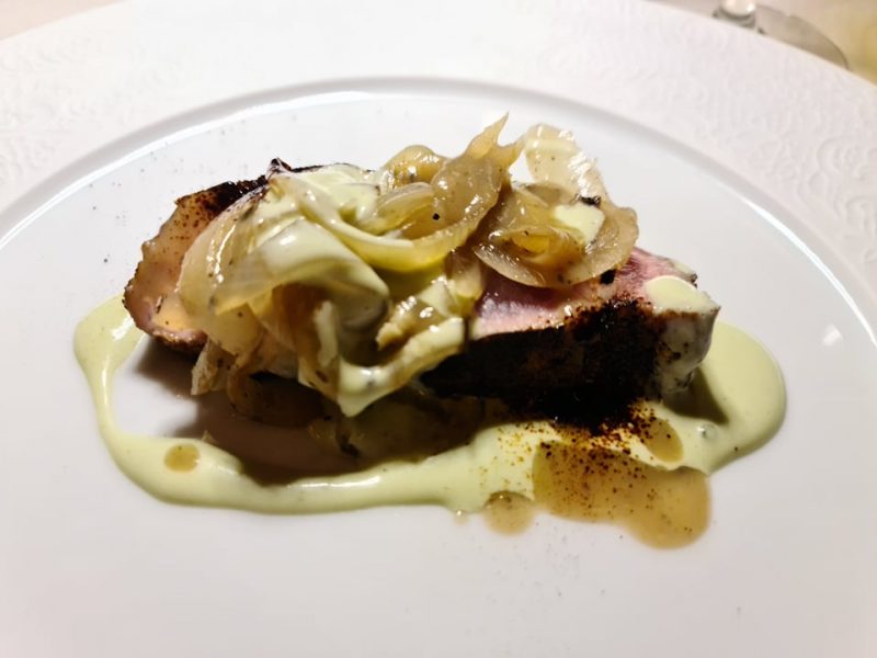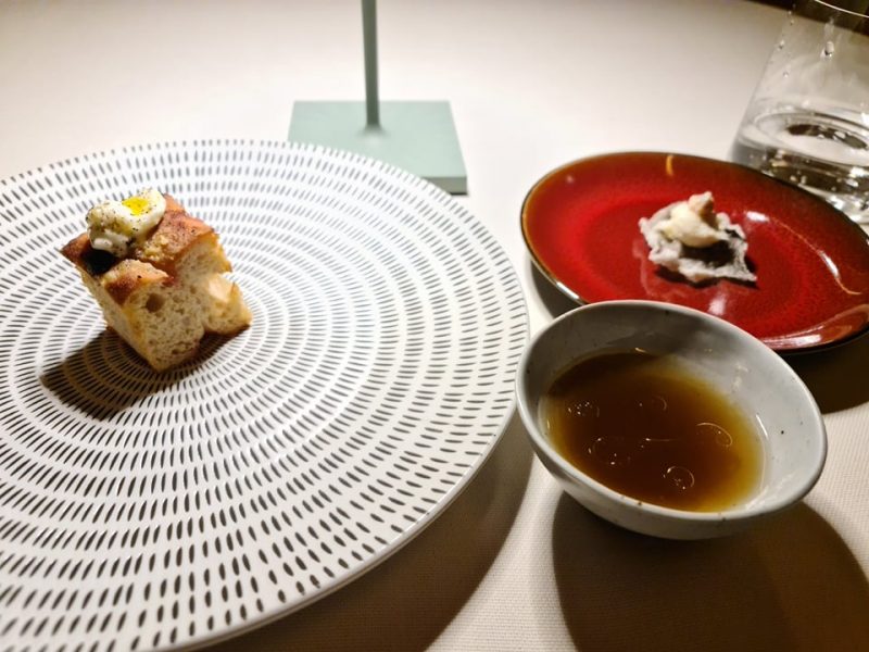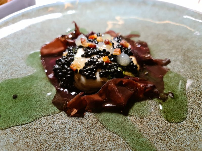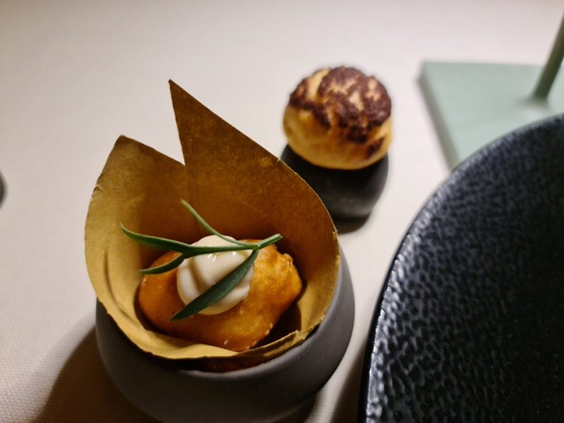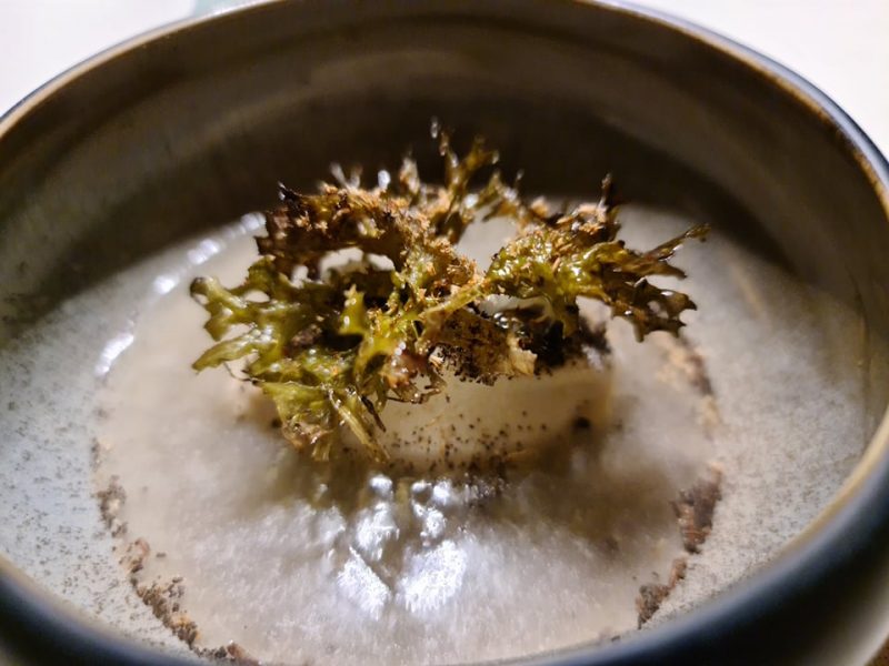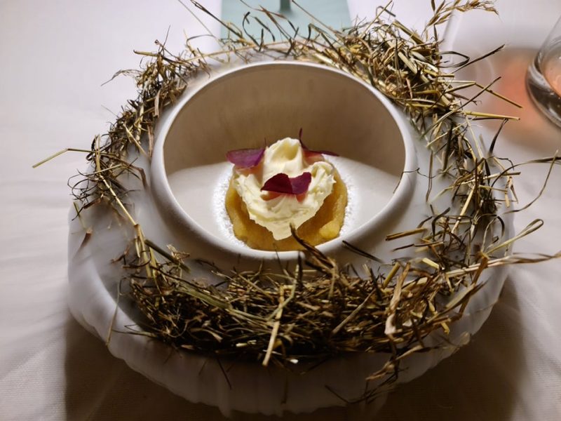 Nei piatti salati non c’è sale aggiunto, nei dolci non c’è zucchero aggiunto. Il cuoco veneto sfrutta sale e zucchero presenti negli ingredienti. Baccalà, maiale e cervella fritta, solo il preludio a quello che è il primo colpo della serata. Budino di siero di latte alle aringhe e mandorla amara, kimchi di pompelmo rosa e aglio orsino, completamente spiazzante. Il gusto è complesso, i continui cambi di ritmo al palato sono notevoli. Il budino è quasi una base neutra, che da una leggera sensazione di grasso, dove intorno girano le note amaricanti della mandorla, l’acidità sostenuta e tagliente del kimchi di pompelmo rosa e l’aringa, oltre alla sapidità, fa da bilancia, con l’allungo aromatico dell’aglio orsino.