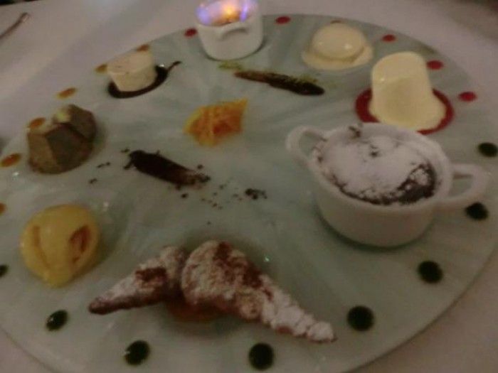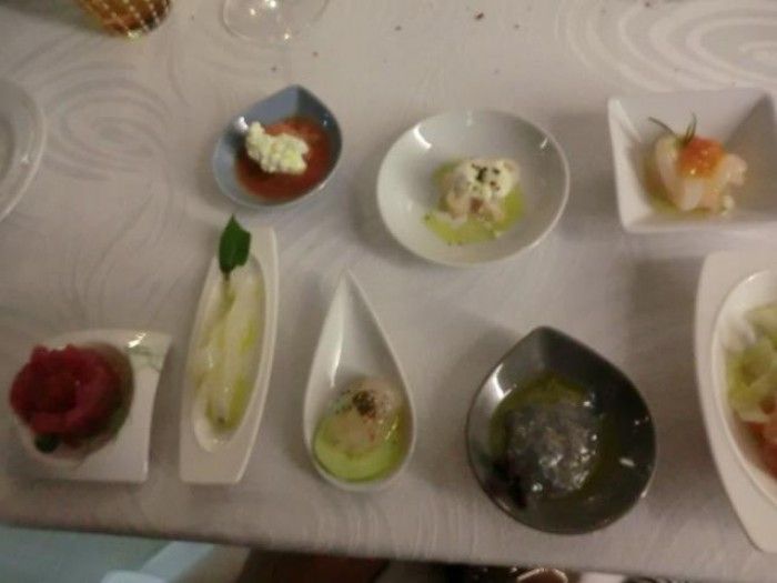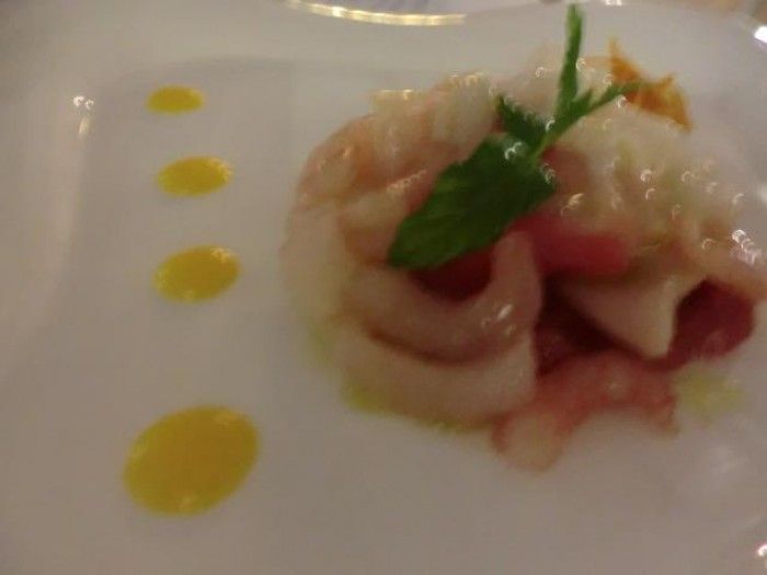 Degustazione di mare alla maniera di Pietro: rotolino di spada con insalata di arance e finocchi con sale affumicato; raviolo di gamberoni con ricotta alla menta e zuppetta di pomodoro crudo; tartara di tonno con sale di Mothya; carpaccio di cernia gialla con marmellata di arance amare; carpaccio di ricciola con crema di mandorle, fave di cacao e sale nero; tagliatelle di totano con sale rosa; scampo con cetriolo ed emulsione di olio e scorze di limone
