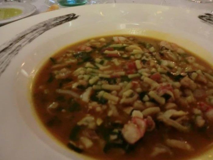 Scelgo la minestra, se l’antipasto era la licenza liceale, questa è la laurea: sapori forti, intensi, concentrati, meridionali. E poi acidità, giochi di consistenze, piacevolezza complessiva. Uno dei migliori piatti di questo inizio anno.