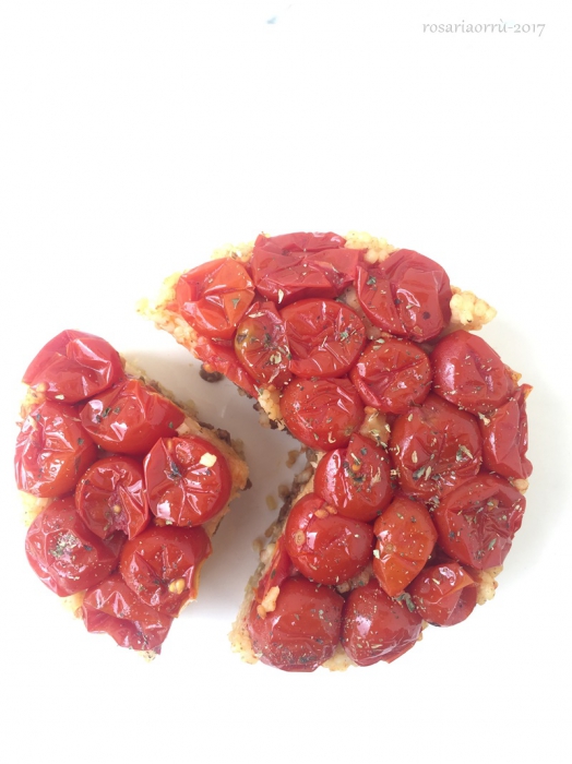 Condite i pomodorini con un pizzico di sale, di zucchero, di origano e 1 cucchiaino d'olio.