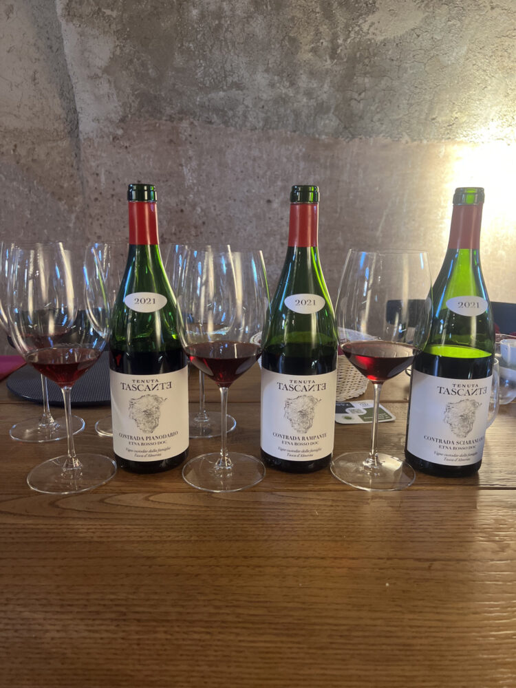 Chiusa questa breve digressione dedicata all’enogastronomia dell’azienda, torniamo in cantina da Michele e vediamo meglio la linea di etichette firmate Tascante. Sull’Etna, questi hanno principalmente tre vitigni: due autoctoni, quali Carricante e Nerello Mascalese, e uno no, lo Chardonnay. Quest’ultima è il protagonista di “C’era già”, vino prodotto dalle uve piantante in contrada Rampante, dall’ottimo potenziale di invecchiamento, che affina in rovere francese di Chassin. C’era già – come lascia intuire il nome – esisteva ancor prima di chiamarsi così. Infatti, prima sull’etichetta il vino recava soltanto il nome del vitigno da cui nasce. Uno storico di produzione di non poco conto, che è stato diffuso in maniera capillare anche a livello locale. Il paragone tra l’annata corrente e la 2015, gelosamente custodita nel ristorante di Parco Statella, è la dimostrazione di quanto appena detto. Bouquet olfattivo ricco e ampio, che spazia dalla frutta bianca matura a forti sentori erbacei: in questo raggio d’azione emerge anche una sfumatura di terziari, vanigliata e piacevole; in bocca – nonostante l’età – è ancora fresco, a riprova del suo potenziale di vita. Perfetto in abbinamento con un piatto a base di funghi o carni bianche (come il maiale).