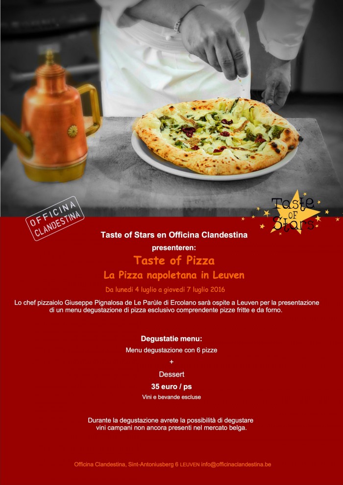 Taste of Stars, che già da alcuni anni si propone di promuovere la cucina italiana nelle sue manifestazioni e tendenze più attuali all’estero ed in particolare in Belgio, non poteva restare indifferente. L’idea di proporre La Pizza in un paese dove l’immigrazione italiana quest’anno festeggia i suoi 70 anni e dove generazioni di immigrati si sono guadagnate il pane proprio attraverso ristoranti e pizzerie, ha dato vita all’evento Taste of Pizza. Dopo gli eventi Taste of Stars con gli chef stellati Maurizio e Sandro Serva de La Trota di Rivodutri nel 2014, tornati l’anno dopo insieme a Mauro Uliassi per un evento più complesso, ed infine Errico Recanati del ristorante Andreina ospitato in gennaio 2016, è ora la volta dello chef pizzaiolo Giuseppe Pignalosa della pizzeria Le Parùle di Ercolano. Tra gli esponenti più accreditati della nuova generazione di pizzaioli, Giuseppe sarà ospite a Leuven nel mese di luglio per presentare un percorso di degustazione di pizza. Prodotti prevalentemente del territorio vesuviano, tra i quali alcuni presidi Slow Food, saranno utilizzati nella preparazione di un esclusivo menu. Non meno importante e sorprendente sarà la piccola selezione di vini campani scelti per rendere questa esperienza più completa.