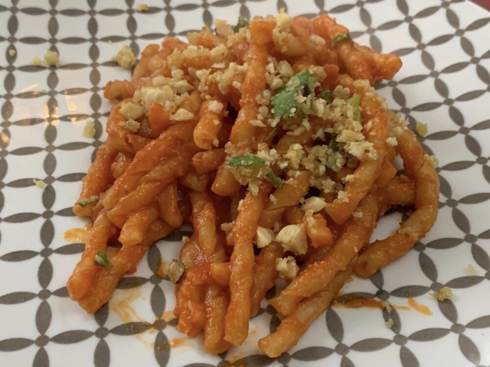 Ci sono i cavatelli, con funghi e salsiccia. Le sciuscelle, una sorta di orecchietta aperta, con il ragù di cinghiale, oppure i fusilli avellinesi (ricciolo stretto e lungo, ottenuto con il ferretto) conditi con una salsa a base di papaccelle e il loro ripieno. Come si vede, sapori forti, pieni e tutti riconoscibili. Per i boomer un bell’esercizio di memoria, senza dubbio.