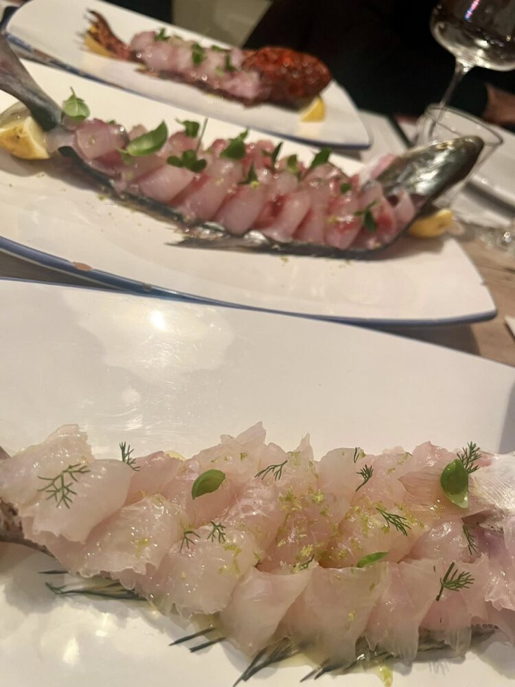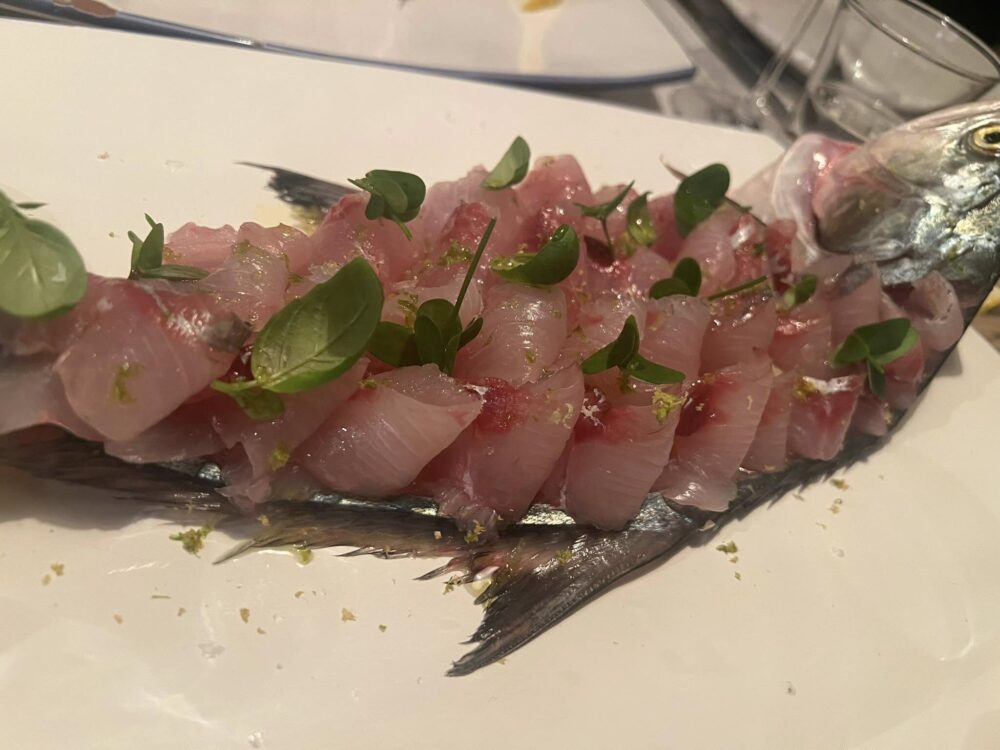 L’ambiente è proprio da trattoria, con mobili e hotellerie che ricordano le classiche osterie a ridosso dei porti fequentate da marinai, scaricatori e appassionati. Sul piano superiore si gode di una bella vista. Alfredo De Luca ha cercato e voluto un equilibrio tra l’ambizione e il tempo da dedicare alla famiglia. Questa cosa ha un nome preciso: professionalità. Amando la famiglia ha dunque attenzione e cura dei clienti e la sala, in un lunedì di pioggia in fondo al Tacco, è piena. Il bancone del pesce da sfilettare e mangiare crudo ci ricorda Tuccino, il primo a specializzarsi nel crudo di mare in tempi non sospetti. Ora è normale trovare nei migliori ristoranti di mare il banco da pescheria, ma nel 2006, quando andammo per la prima volta lì, era una novità assoluta. Sul banco il pescato del giorno, spiccano scorfani dalla carne tenera e piacevole, tonnidi, pesci da zuppa, scampi e tanto altro. Un Paradiso gastronomico.