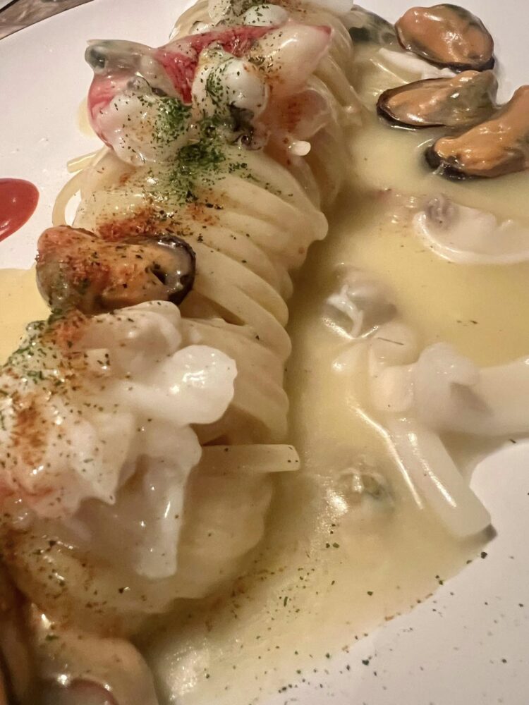 Molti vini della carta sono “in navigazione”, ossia sono finiti. La proposta è buona, ampia, con giusti ricarichi a metà strada fra enoteca e ristorante, magari andrebbe raffozarzata ulteriormente in profondità di annate. Non siamo in un locale per sboroni alla Lacerenza, ma bechciamo belle etichette francesi e italiane.