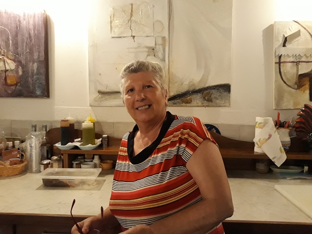 La Taverna è una piccola cartolina, che nasconde sul retro una suggestiva terrazza sul mare, con una vista mozzafiato. Un pergolato d’uva bianca, vasi dipinti a mano, tovaglie di lino ricamate e fiori ovunque, come piaceva alla mamma di Lina, che amava i gerani e le ortensie: i colori di questa location rapiscono i turisti e ricordano quelli delle isole greche. I profumi che arrivano dalla cucina a vista raccontano la storia del posto, con ingredienti freschi e rigorosamente stagionali. Il menu comprende poche proposte, come il gambero marinato al verdello (18€), gli spaghettoni freschi alle sarde (16€) o il pesce spada alle erbette con cipollina in agrodolce e peperone rosso al forno (18€). Servizio cortese e attento: Lina ha accolto la mia bizzarra richiesta di un dessert con un sorriso e grande ospitalità, nonostante fosse molto tardi.