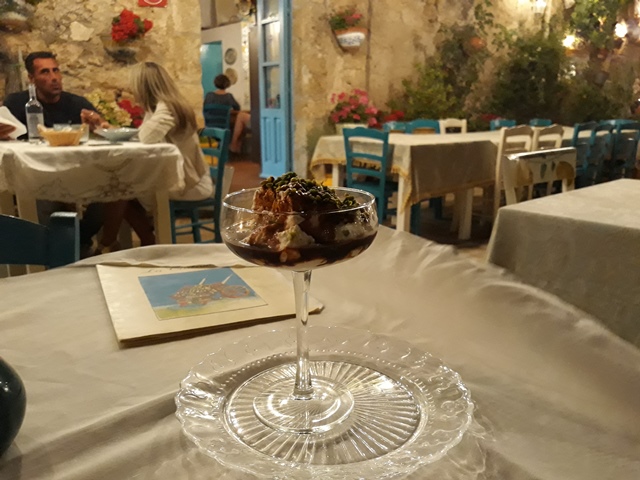 Questa non è una vera e propria recensione, ma il racconto di un dolce consumato sotto le stelle di questo antico borgo di pescatori: la Crema di ricotta al vino cotto (7€), il dessert che meglio rappresenta Lina e che rimanda alla tradizione locale del vino cotto.