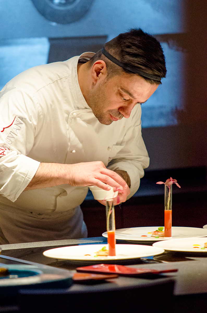 Molta tecnica ed attenzione maniacale ai particolari, amore per i colori e materia prima eccellente. La sua cucina conserva gli elementi della sua terra, uniti a quelli classici e più amati del bacino del Mediterraneo, ma ama dargli nuove forme, inventare nuove strutture.