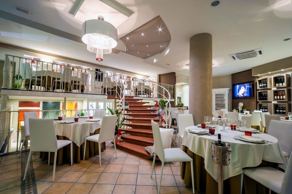 Non sarà stata facile la vita di questo ristorante-isola all’inizio, varcare la soglia della Taverna significa chiudersi alle spalle la confusione dei paesi vesuviani, che si annulla nelle linee pulite e nel bianco prepotente della grande sala su più livelli.