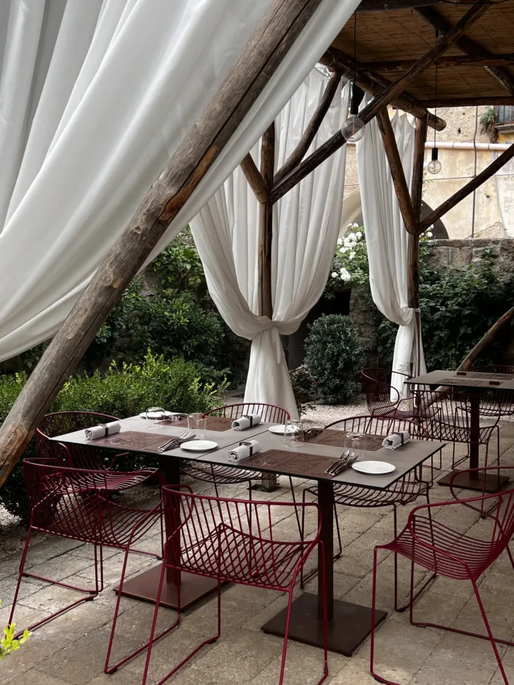 Questo locale si fa forse un po’ fatica a scovarlo, o meglio si fa fatica a pensare che un comunissimo ingresso a volta fatto in pietra, come ce ne sono tantissimi in zona, nasconda prima un ristorante elegante e poi un giardino rigoglioso dove Valentina e Raffaele D’urso, moglie e marito da pochi giorni, accolgono i loro clienti.