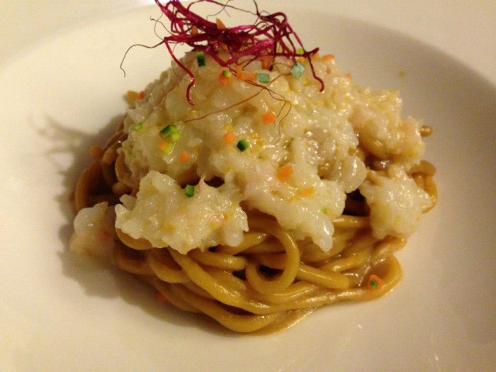 Gustoso anche il primo piatto marinaro, con la classica chitarra fatta in casa (anche se qui forse uno spaghetto di grano duro avrebbe reso meglio) e un misto crudo e cotto di scampi reso piacevole e vivace da un gradevolissimo effetto agrumato.