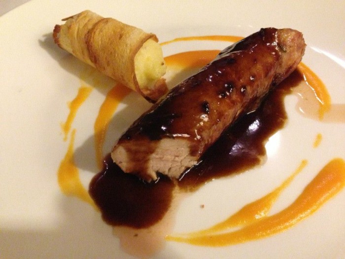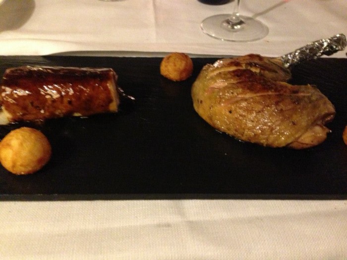 Classica, ma ben eseguita e succulenta al punto giusto, la faraona, servita con il petto arrotolato e la coscia.