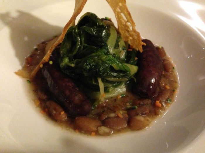 Vecchia ricetta rivisitata, invece, per il secondo antipasto: qui la tradizionale zuppa di scarole e fagioli viene “rinforzata” con piccole salsicce “pezzente” di maiale nero casertano. Anche in questo caso la parte grassa del piatto è ben equilibrata con la semplicità della verdura e dei legumi.