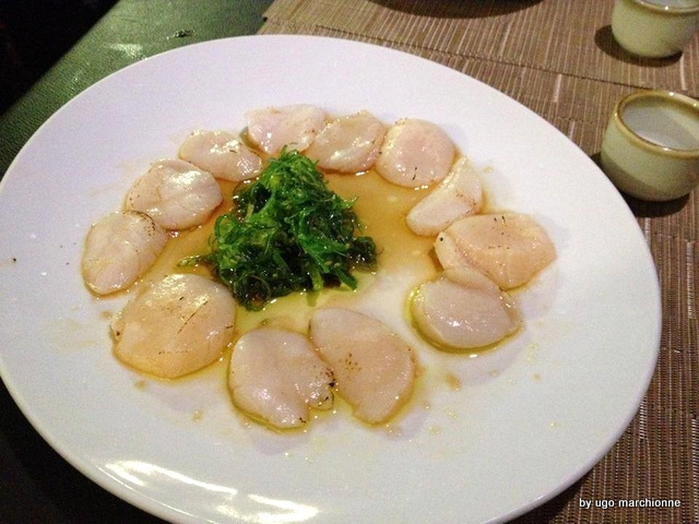 Se poi avete voglia di concludere in bellezza, anzi in dolcezza, un girotondo di capesante scottate sulla robata, la griglia inventata originariamente ad Hokkaido per cuocere il pesce, semplicemente marinate e servite con una divertente insalatina di alghe wakame ed olio di sesamo, forse è quello che fa per voi, più di un dessert.