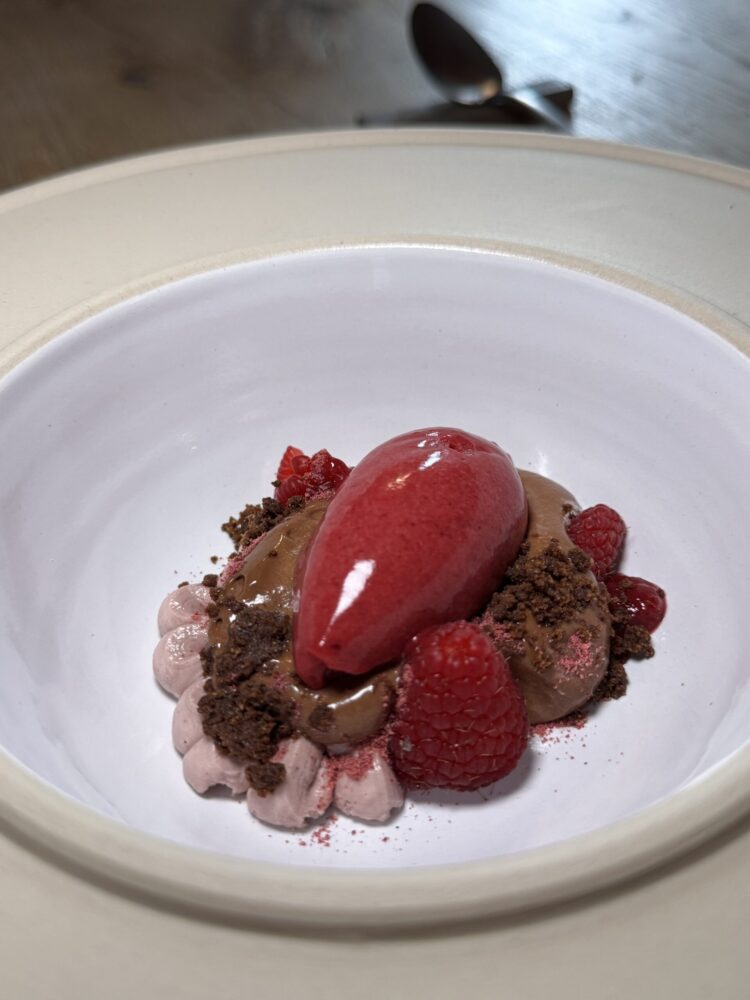 Sorprendente il suo predessert con con cagliata e caramello al pane, e il suo cioccolato e lampone è strepitoso.