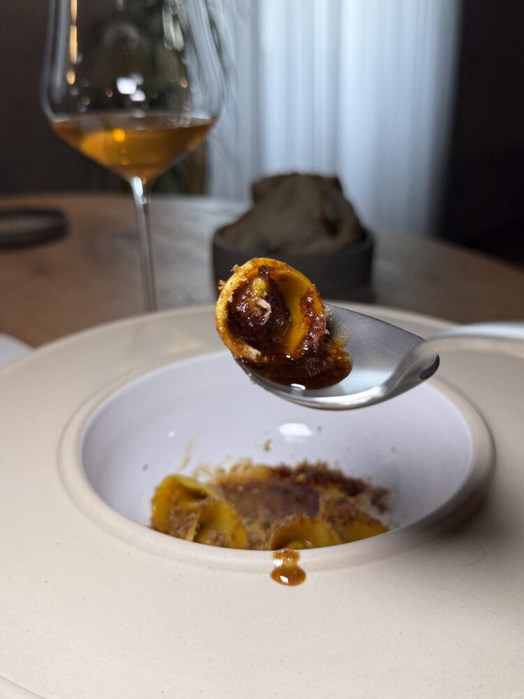 Imperdibile a mio avviso l’assoluto di verza, verza stracotta per 15 ore a 150 gradi, servita con il proprio fondo e con confettura di rosa canina e cardamomo in polvere.