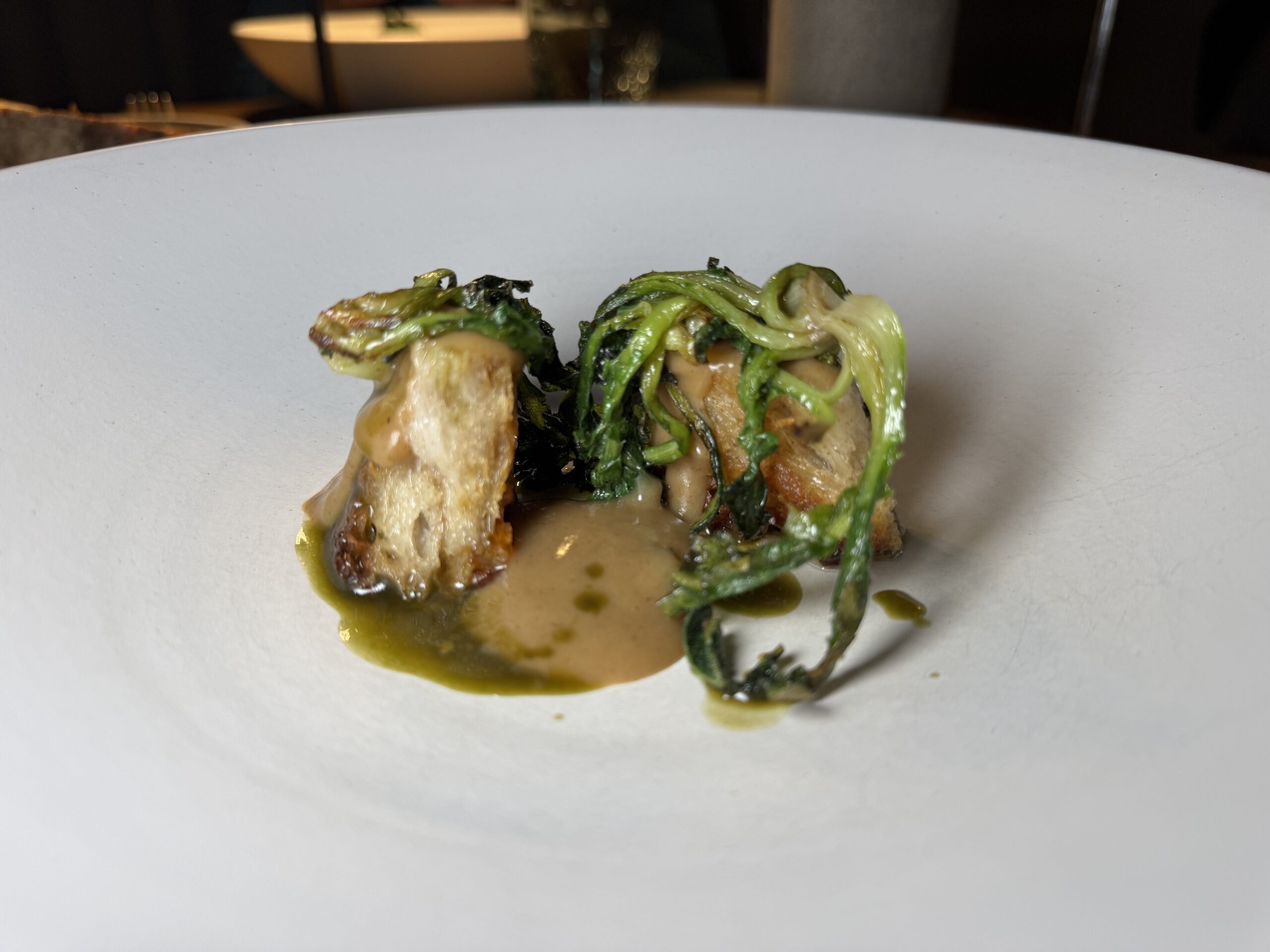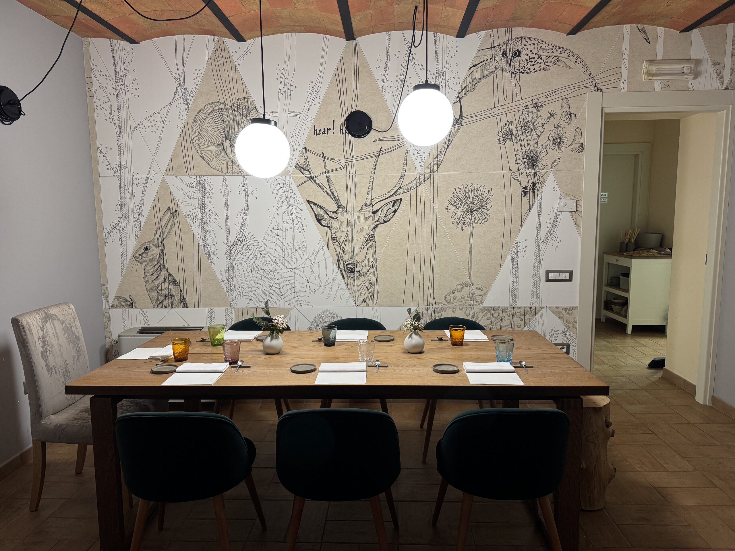 Qui, tra 320 ettari di bosco privato, il concetto di filiera corta si spinge al massimo grado: la cacciagione proviene dalla riserva faunistico-venatoria della tenuta stessa, gestita attraverso un sistema di caccia selettiva sostenibile, in equilibrio con l’ambiente. È da questa materia prima viva, concreta, mai anonima, che nasce una cucina identitaria e sorprendente, guidata dallo chef Alessio Pierini, giovane talento eugubino con una solida formazione all’ALMA e un’esperienza trasversale che va dalla tradizione locale all’ispirazione asiatica.