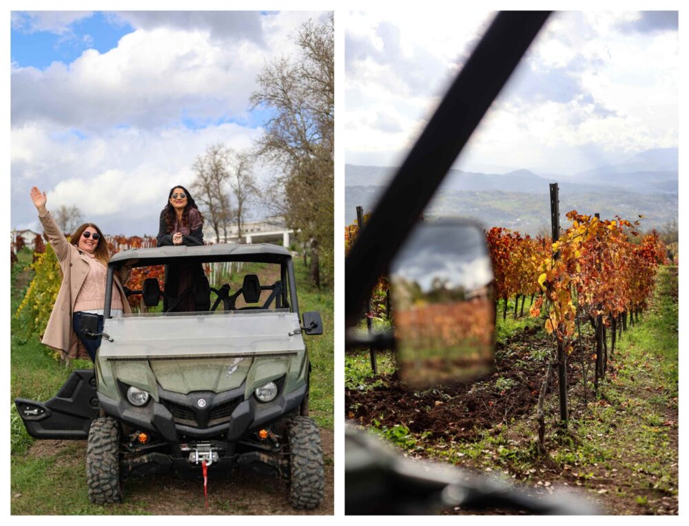 Accanto alla famiglia prende forma una visione chiara: coltivare la terra con rispetto, raccontare il territorio attraverso il vino e preservare un legame autentico con l’Irpinia, terra di grandi vitigni e straordinarie sfumature geologiche. Quando arrivo alla Tenuta, il colpo d’occhio è immediato: i filari sono un mosaico di colori caldi, il sole illumina la campagna e sembra quasi che il paesaggio respiri insieme alle stagioni. Emilia mi accoglie con un sorriso e mi invita a salire su una piccola macchina agricola. Da qui inizia la nostra esplorazione tra i vigneti, un percorso che la Tenuta offre a chi desidera vivere una wine experience autentica, dove si impara osservando, ascoltando e soprattutto immergendosi nel territorio.