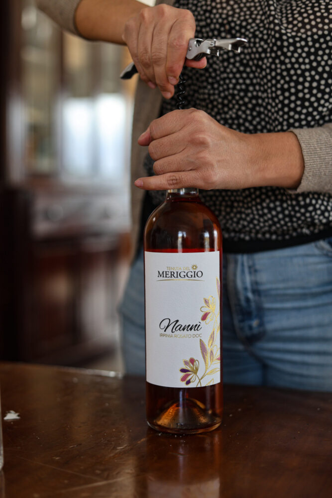 Abbiamo degustato anche il rosé della Tenuta, un vino chiamato Nanni’, dedicato affettuosamente alla nonna di Emilia, che in famiglia veniva chiamata proprio così. Il Nanni’ è un irpinia rosato Doc fresco, gentile e profumato, capace di raccontare una storia familiare e insieme un territorio. Lo abbiamo abbinato a una bruschetta con pomodoro, un accostamento semplice ma perfetto, che valorizza la sua immediatezza e la sua piacevole sapidità.