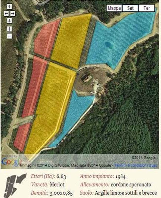 Piantata totalmente a merlot, grazie all’intuizione di Thcelicheff che credette subito nelle sue potenzialità, questa collina viene divisa formalmente in tre fasce: Masseto Alto (in celeste), Masseto Centrale (in giallo) e Masseto Junior (in rosa).